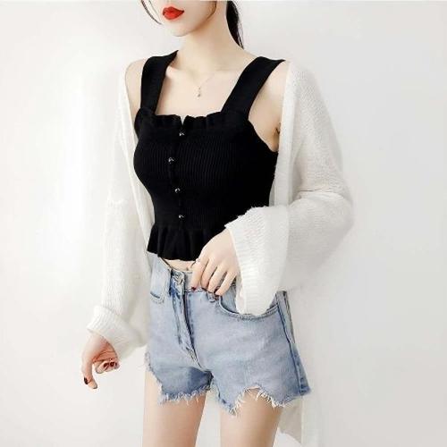 [엄지척]단추 레이어드룩 스퀘어넥 콩 프릴 크롭 민소매_19627970_667501