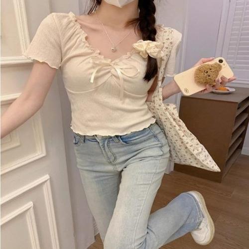 [엄지척]여성 리본 크롭 반팔브라우스 이너 레이어드 블라우스_19660535_667501