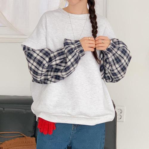 [옷자락] 여자 레이어드 체크 퍼프 배색 오버핏 기모 맨투맨