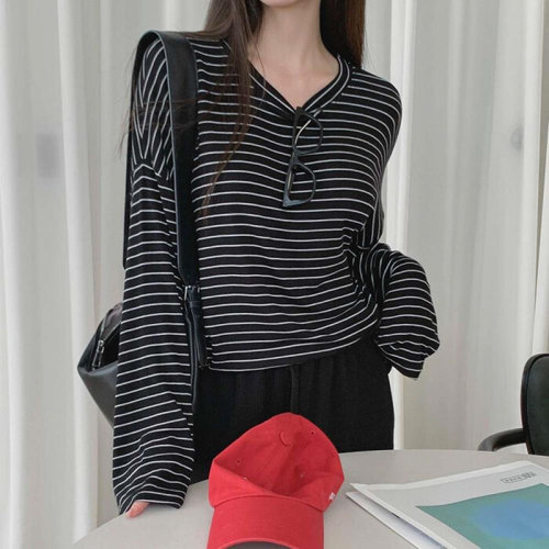 [옷자락] 여자 레이온 스판 스트라이프 라운드넥 긴팔티