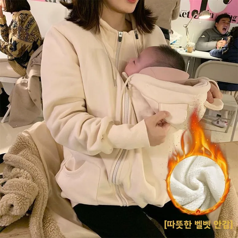 캥거루 프린트 플리스 안감 후드 원피스 여성 플러스 사이즈 방풍 가을 겨울 임부복 한국 스타일 긴 소매 지퍼 클로저