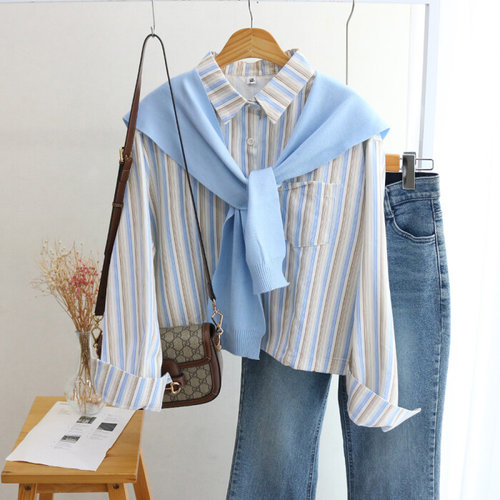 레이츄 / 올데잇 밑단 스트링 루즈핏 스트라이프 셔츠+니트 숄 코디세트