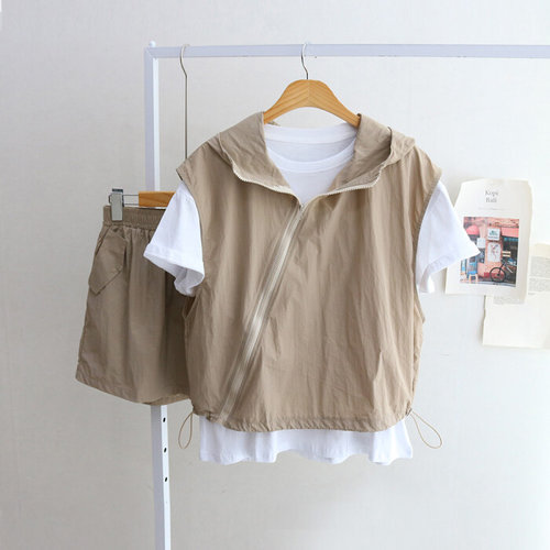 레이츄 / set 사선 후드 집업 조끼+티셔츠+반바지