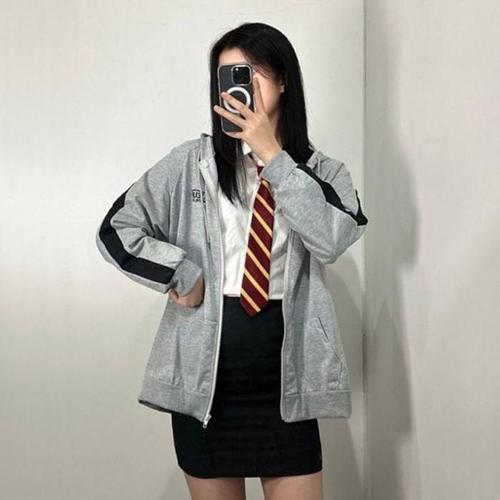[라일리여성의류] Rly 아우터 배색후드집업 오버핏후드집업 레터링후드집