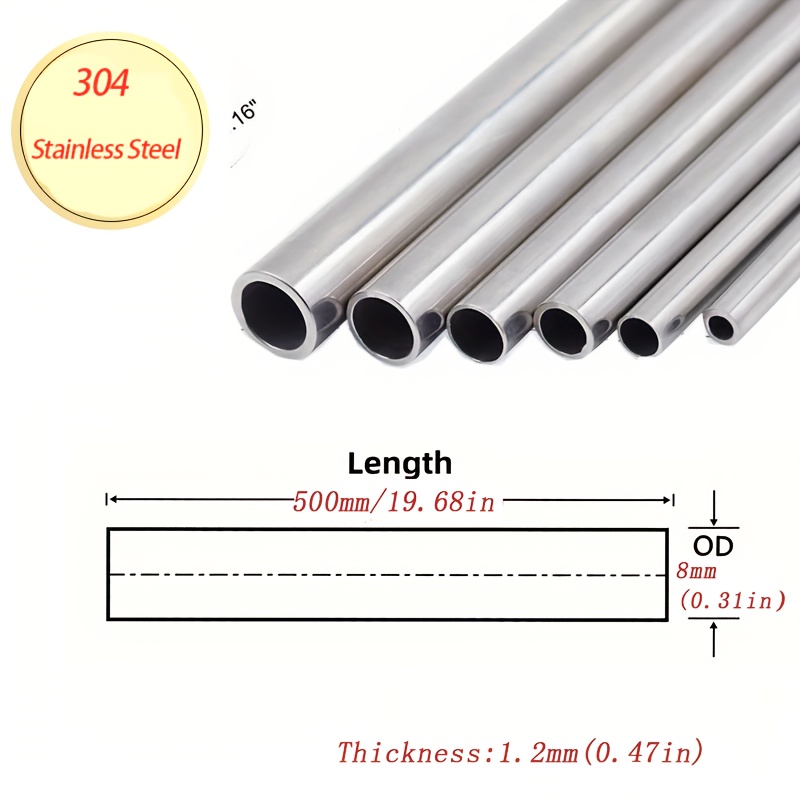 TEMU 304 스테인리스 스틸 중공 원형 로드, 두꺼운 튜브 벽, 산업용 무봉제 직선 캡일러리, 표면 연마 처리, 원형 튜브 지름 5/6/8/10/12/14/15/16/19 길이 500mm