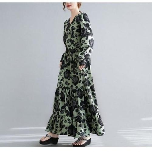 [에이비에프지]V넥 플라워 패턴 긴팔 롱 원피스 APZ1ZO33C