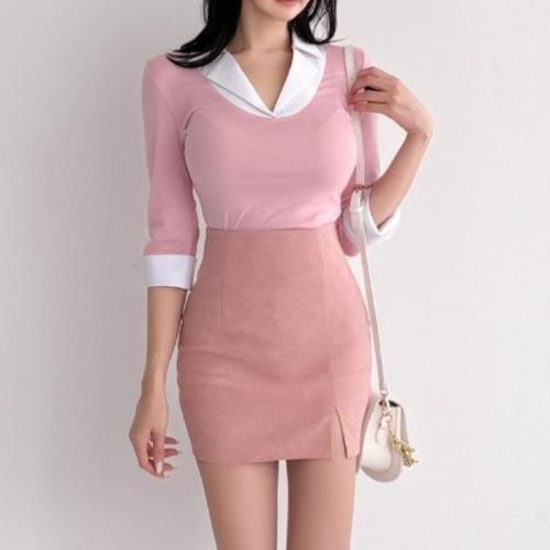 [옷자락]여성 클래식 슬림핏 가죽 트임 H라인 미니 치마