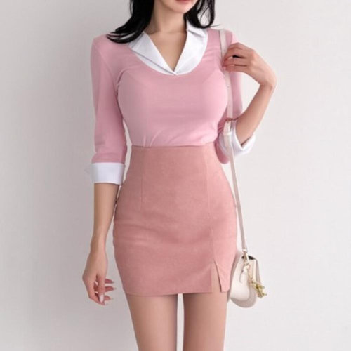 [옷자락]여자 클래식 슬림핏 레더 트임 H라인 미니 스커트