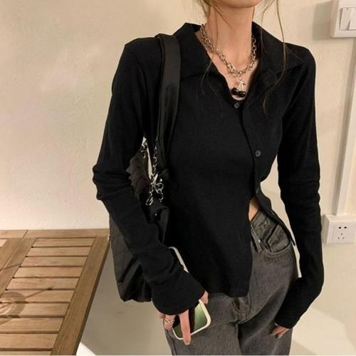 [엄지척]여성 페미닌 롱슬리브 카라 골지 니트 단추 티셔츠_19802326_667501