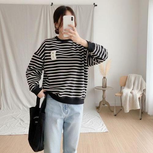[셀러허브_여성트랜드패션]여성 링거넥 FW 보온 롱슬리브티 줄무늬 맨투맨