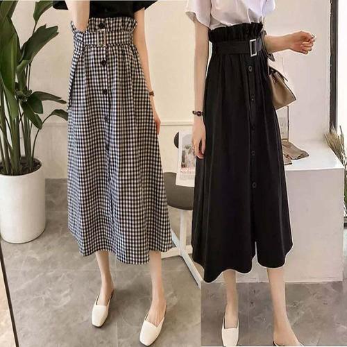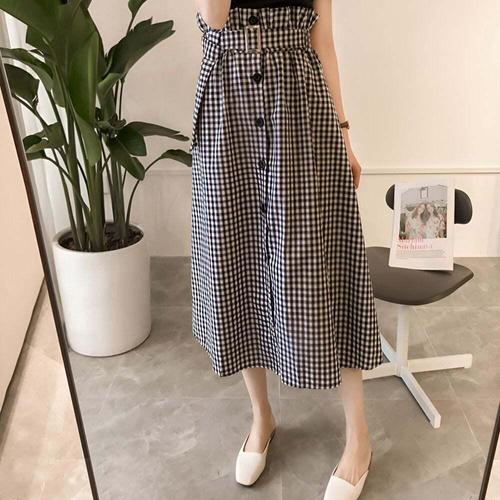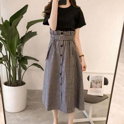 [셀럽하우스]롱 IUHU9087 체크 캐주얼 스커트 반팔 필수템 투피스 세트 여성