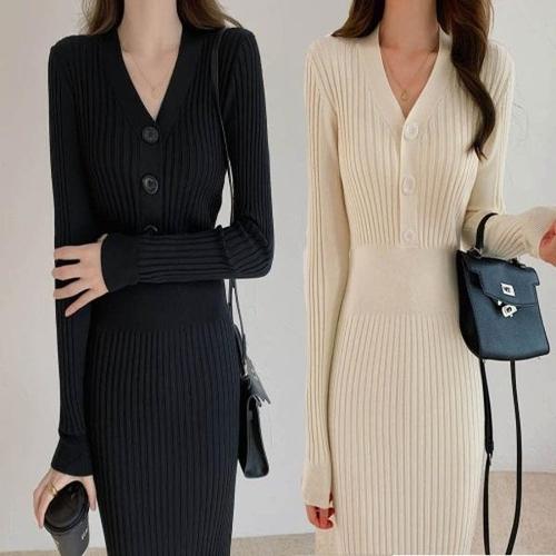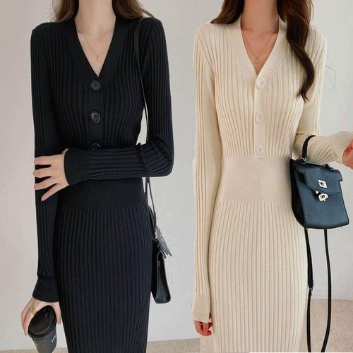 겨울 골지 여자 이너 니트 니트원피스 롱 슬림핏 V넥 WFLQ83T