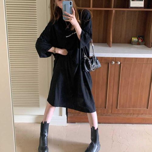 편안한 루즈핏 블랙 반팔 원피스 롱티셔츠 캐주얼 (WFK5UCR)