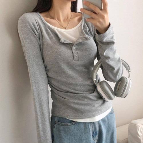 [다잇템]여성 콘트라스트 잔주름 슬림핏 롱슬리브 티