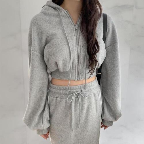 [옷자락] 여성용 후리스 후드티와 스트링 반집업 롱스커트 세트