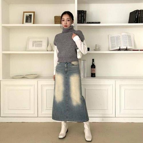 [드레스날다]언밸런스한 H라인 옆트임 데님 롱스커트(mskt1096)