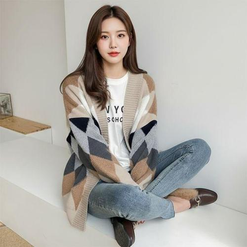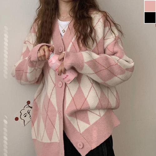 [오너클랜]인기상품 여성가디건 여성 브이넥 아가일 2컬러 루즈핏 패턴 가 [WD8DFEA_250919]