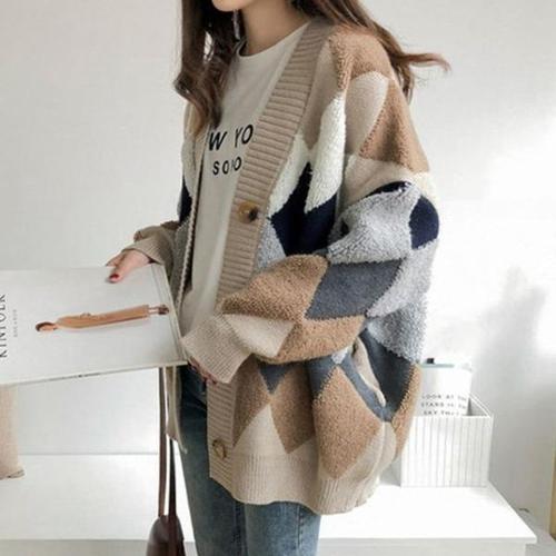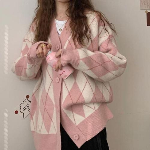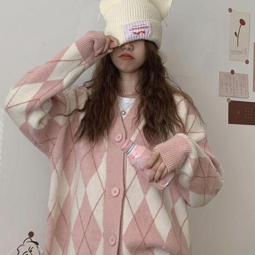 루즈핏 브이넥 가디건 가을 아가일 봄 배색 (WFJSM4O)