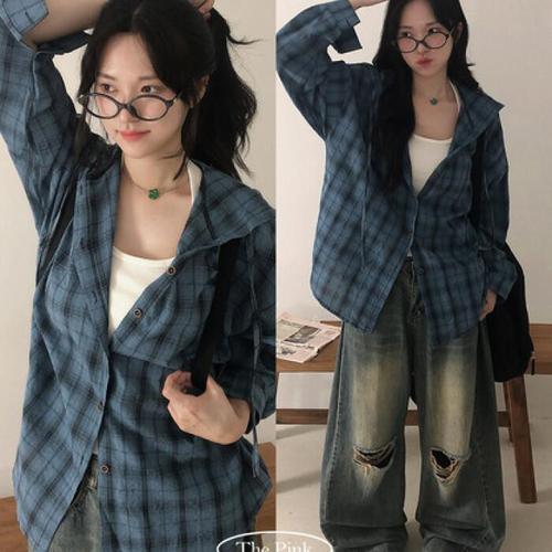 더핑크 / 루지 체크 오버핏 긴팔 후드 셔츠 남방