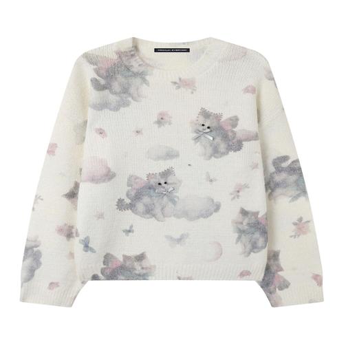 [미니멈에브리데이][미니멈 에브리데이]리본 캣 자수 나염 라운드 니트 (EB4KT021D)