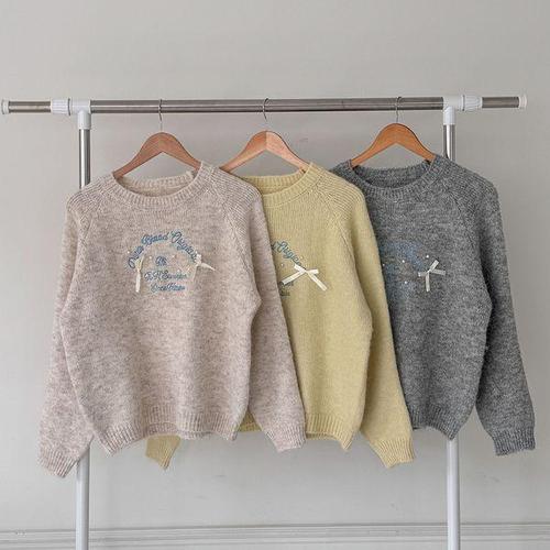 [옷자락]여성 러블리 진주 리본 자수 울 라운드 니트