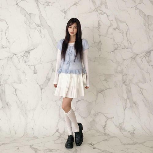 [신상오픈런]여성 리본 장식 니트 랩 스커트와 레이어드 부츠컷 팬츠 세트