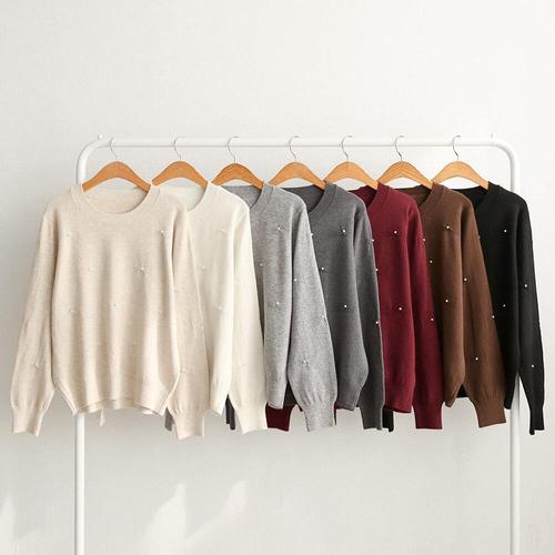 [옷자락]여성용 러블리 진주 장식 리본 7색 라운드넥 와인 니트