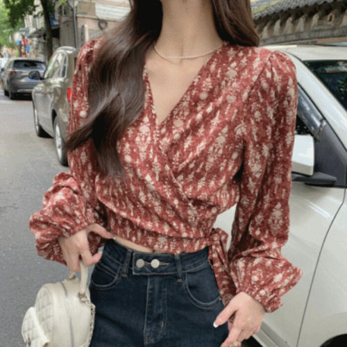 [셀럽하우스]여성 IGHF9351 2컬러 플로럴 랩블라우스 허리리본 퍼프소매