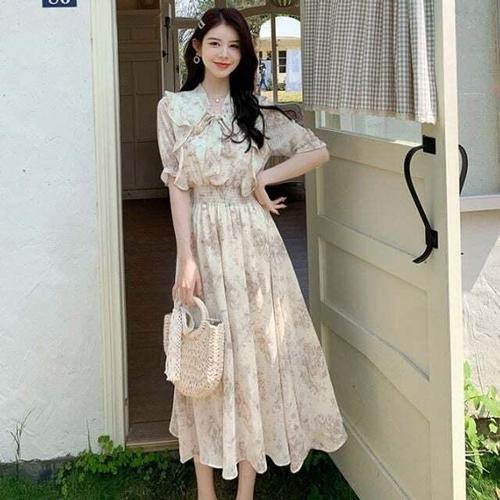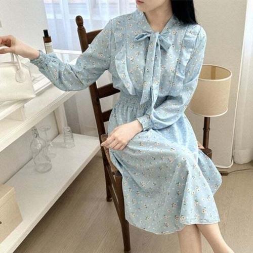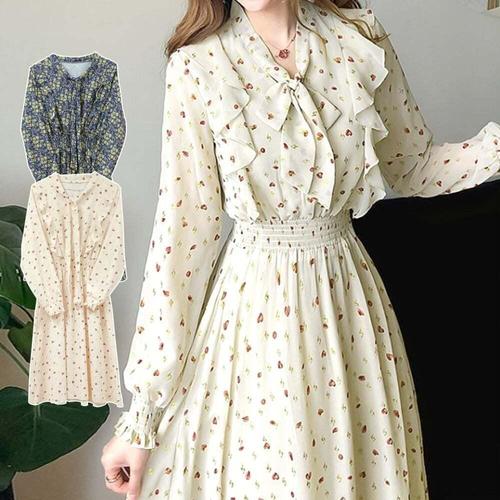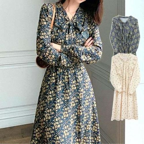 [셀럽하우스]꽃무늬 KYQG1120 여성 캐주얼 원피스 리본 필수템 프릴 쉬폰 롱