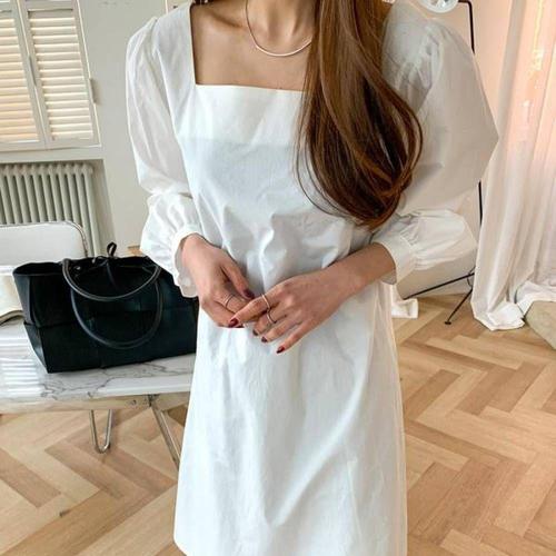 스퀘어넥 리본 쉬폰 원피스 여름 퍼프소매 뷔스 WFKOIYV