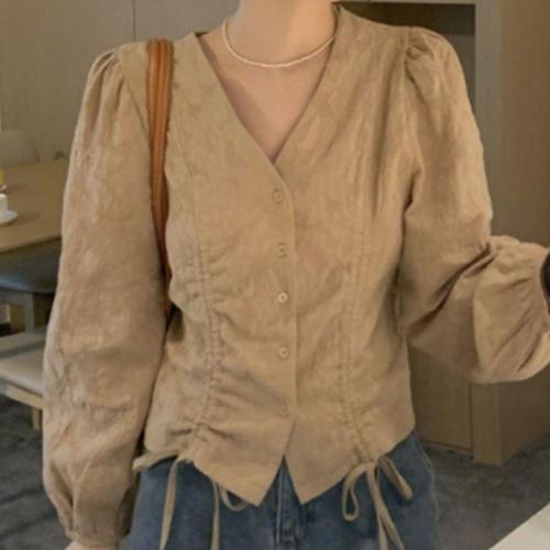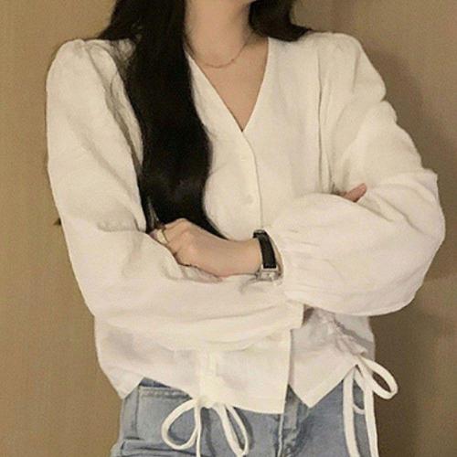 여성 브이넥 셔링 스트랩 블라우스 고급 데일리룩 WFKMEKA