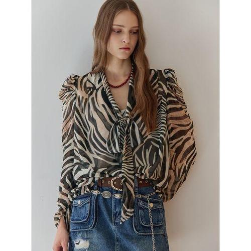 [마쟈]지브라 시스루 타이 브이넥 쉬폰 블라우스