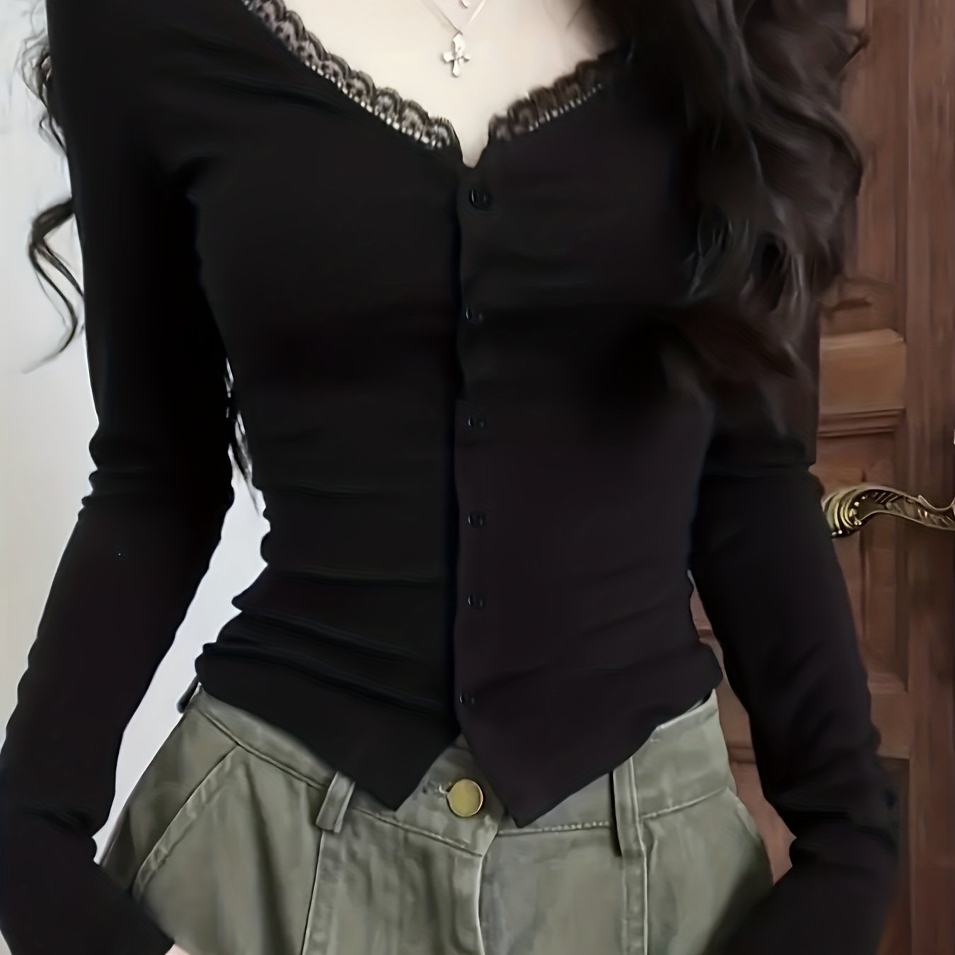 TEMU 여성용 슬림핏 V넥 긴팔 블라우스 - 대조 레이스 트림, 우아한 A라인 탑, 봄 여름 가을용, 다목적 레이어링 피스, 단색, 벨트 없음, 풀오버 스타일, 레이스 블라우스, 가디건, 여성원피스, 여성 상의|여름블라우스