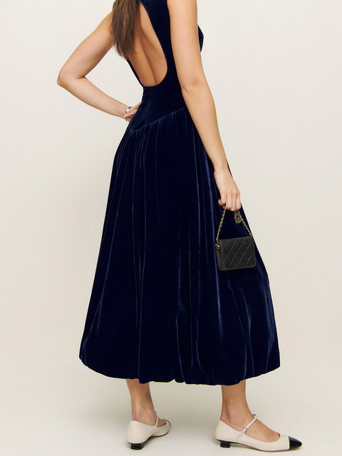 [리포메이션] 벌룬 헴 오픈 백 벨벳 드레스 (Elvira Velvet Dress)_네이비 RF14307072
