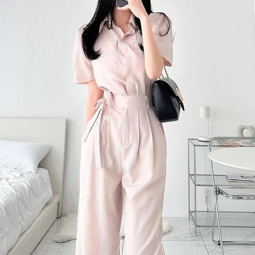 [옷자락] 여자 봄 여름 스타일 린넨 반팔 카라 셔츠 팬츠 세트