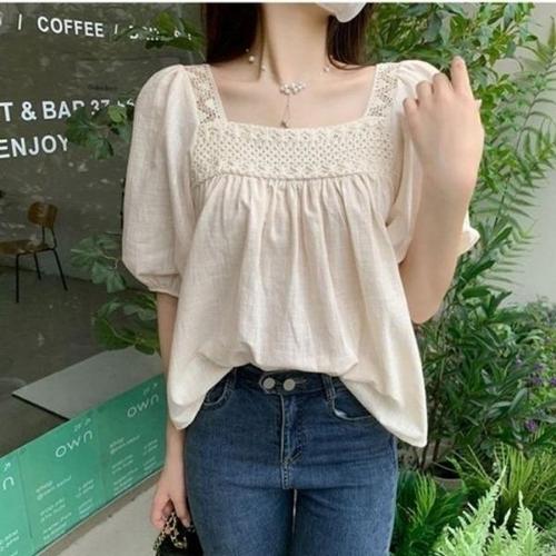 Asure 여자 라운드넥 린넨셔츠 루즈핏 무지 블라우스