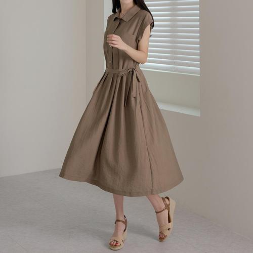 [신상오픈런]여성용 클래식 린넨 핀턱 디테일 반팔 A라인 롱 드레스