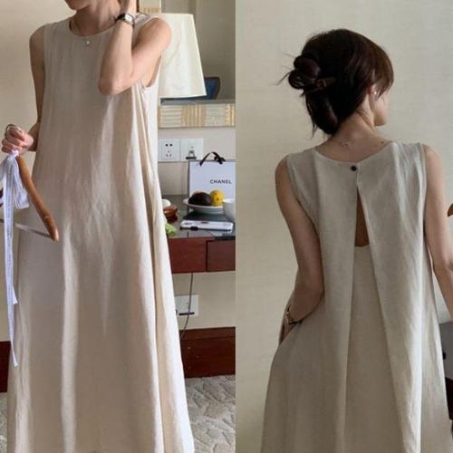 TIMEPURE 봄여름 신상 여성용 뒷트임 나시 롱 원피스 빅사이즈 심플 컷아웃 미디 라운드넥 캐주얼 프리미엄 민소매 원피스