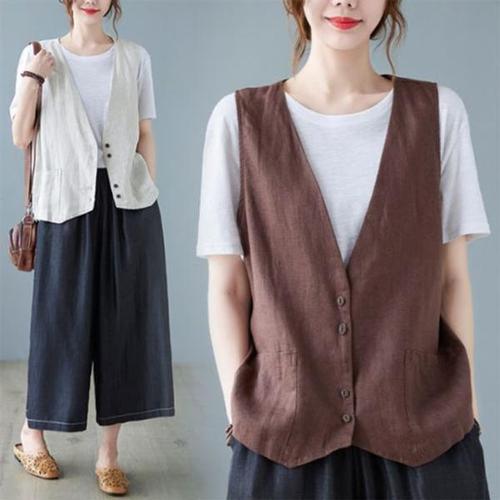 여성용 브이넥 캐주얼 면 린넨 베스트