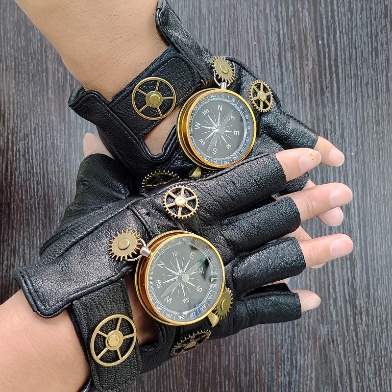 TEMU 1쌍 영감 손가락 없는 장갑 - 금속 나침반 & 기어가 있는 인조 가죽, 펑크 록 스타일, 리벳 장식, 할로윈 코스프레 액세서리, 부드러운 폴리에스터 충전재, 손세탁 가능, 할로윈 의상 장갑 | 장갑 | 내구성 있는 손가락 없는 장갑