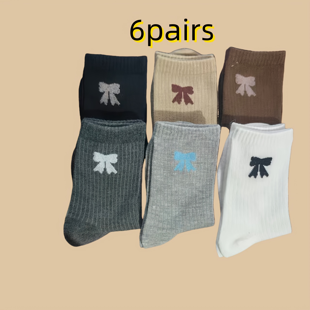 TEMU 여성용 미드 카프 양말 6켤레 - 부드럽고 통기성이 좋으며 귀여운 리본 장식, 사계절 데일리 & 포멀 웨어, 세탁기 사용 가능, 브라운, 패션 애호가, 편안한 착용감, 스타일리시한 신발, 캐주얼 의상, 양말 수집가, 여성 양말