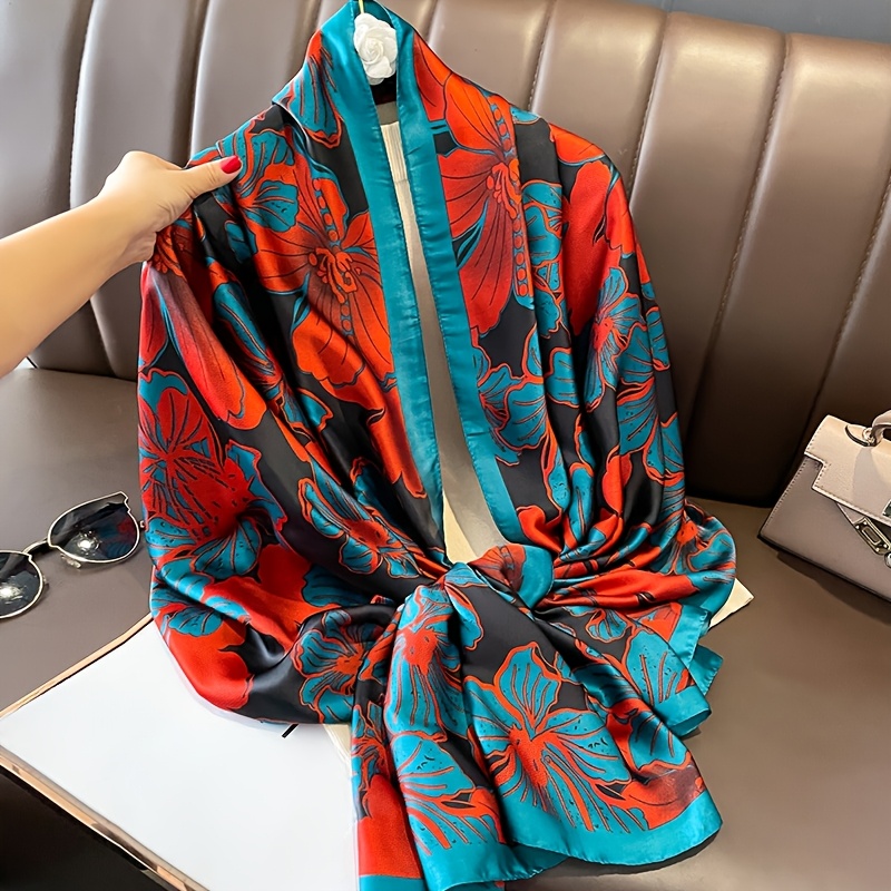 TEMU 남녀공용 생생한 레드 플로랄 프린트 새틴 스카프 - 가벼운, 방풍 쇼울 랩 | 대형 사이즈, 다용도 패션 액세서리 및 비치 타월 | 부드러운 폴리에스터 원단, 레트로 스타일, 손세탁 또는 드라이클리닝|비치타올