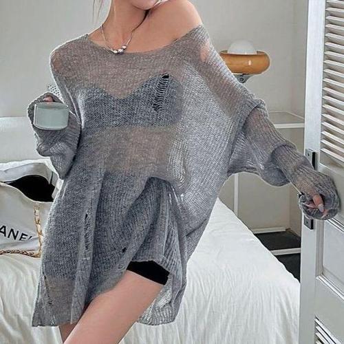 [에이치플러스몰]여성 시스루 루즈핏 빈티지 망사 긴팔 니트 티셔츠