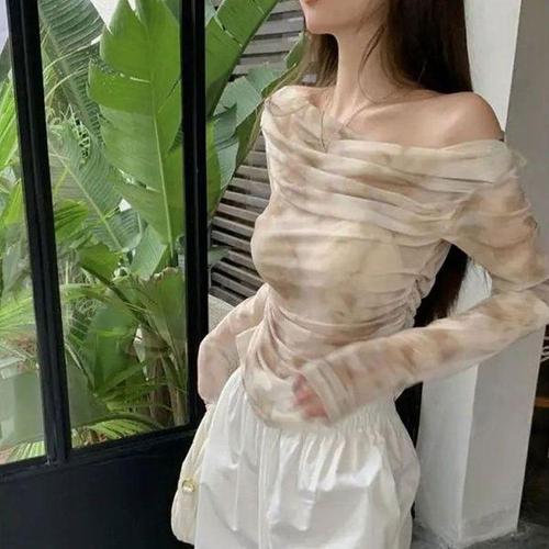 오프숄더티 망사 물감 허리 셔링 긴팔 티셔츠 SH 500399