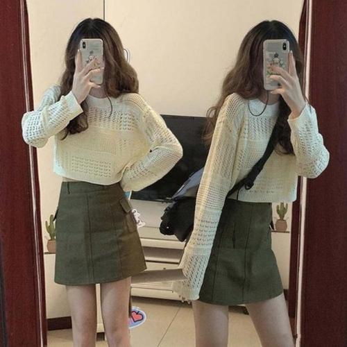 [에이치플러스몰]크롭 여름 데일리 그물 긴팔 클래식 니트 망사