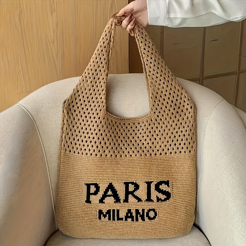 TEMU 여성용 파리 밀라노 토트백 - 우아한 홀로 크로셰 디자인, 고정 어깨끈 & 오픈 탑, 내구성 있는 폴리에스터, 카키/베이지, 해변 및 쇼핑 가방, 캐주얼 & 포멀 사용 가능