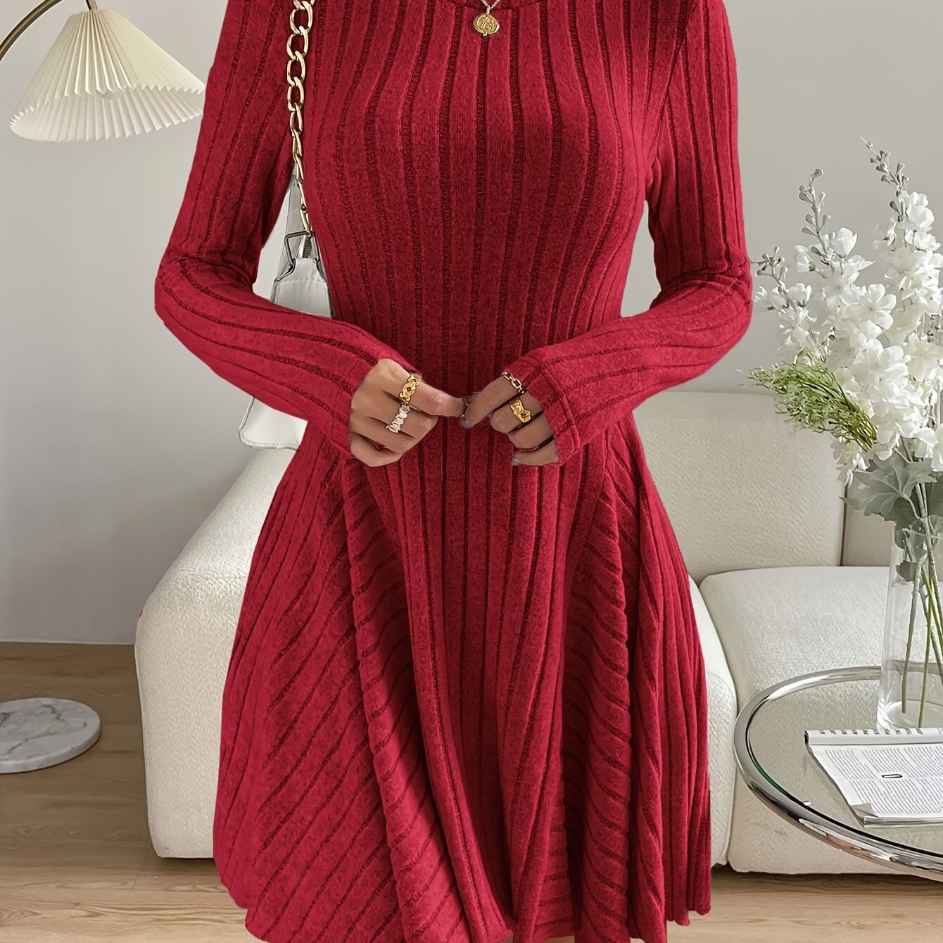 TEMU 여성용 캐주얼 롱 슬리브 쓰리쿼터 소매 드레스 - 생기발랄한 레드 라운드 넥 루즈핏 H라인 실루엣, 기계 세탁 가능 가을 겨울 아웃웨어, 편안한 패션 탑스 및 블라우스