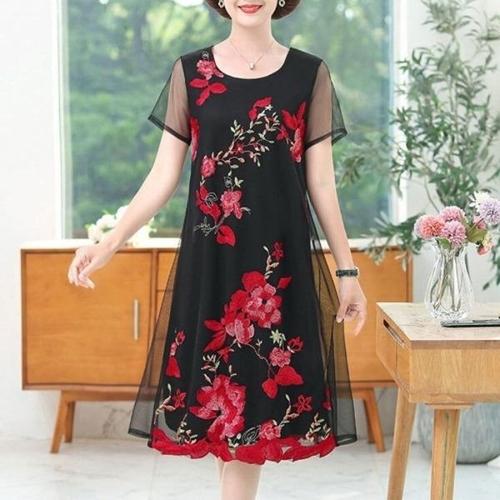 [엄지척]여성 여름 간절기 플라워 자수 이중 메쉬 반팔 원피스_19870236_667501