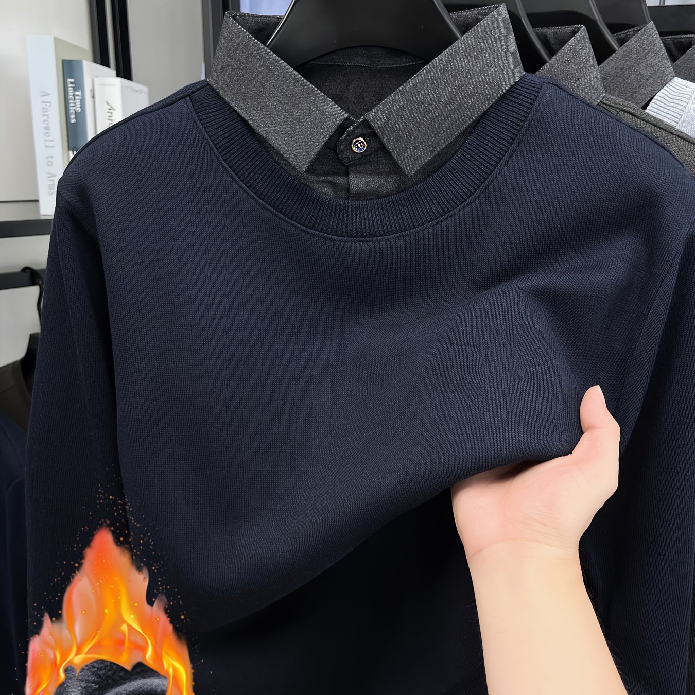 TEMU 남성용 페이크 투피스 스웨터, 가을/겨울 신상 - 안감 두꺼운 보온 니트 스웨터, 남성 골프 스웨터 베이스 레이어, 페이크 투피스 셔츠 칼라 디자인, 솔리드 컬러 캐주얼 라운드넥 긴팔 풀오버 스웨터 탑
