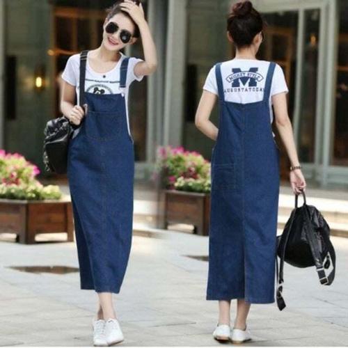 여름 편하고 시원한 캐주얼 진청 데님 롱 멜빵 치마 vJf7+6nsa